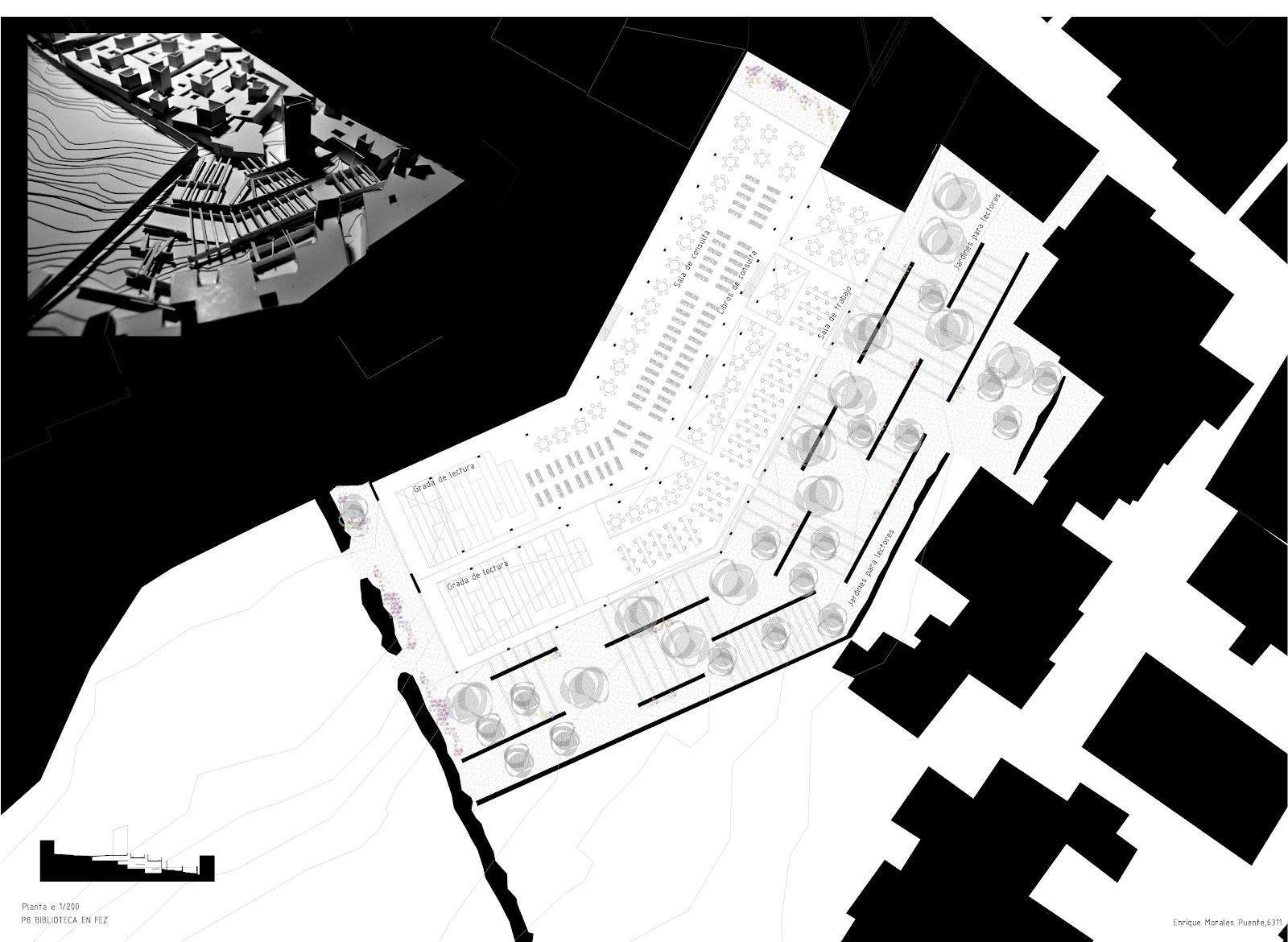 Estos son los avances en los que se inserta de mejor manera el proyecto en el solar de forma que las rampas se quiebran mirando a la muralla y adecuándose a la topografía , a la par que rompen la escala tan exagerada que tenían antes. Un sistema de emparrillado apoyados en los lucernarios por los que treparán plantas procedentes de unos maceteros paralelos a los lucernarios harán las rampas más agradables. .En cuanto al interior se clarifican las funciones en el proyecto con la biblioteca vertical de investigadores y la biblioteca común de desarrollo horizontal en bancales, siendo el de entrada el más público con cafeteria, zona de exposiciones y aulas, y el resto las salas de trabajo y lectura más tranquilas.La luz entra por lucernarios longitudinales que tendrán la profundidad suficiente para que la luz no sea directa y sea uniforme.Las viviendas se sitúan al norte del solar con forma de L que cierra el conjunto por ese lado y crea un ámbito de entrada junto con la torre.